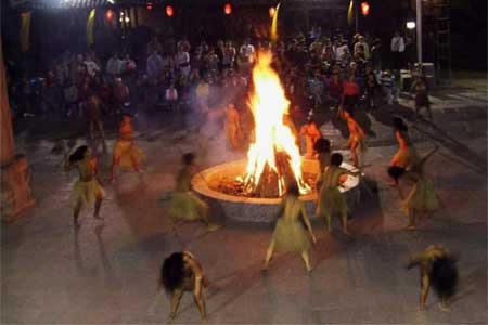 “擺手”,土家人稱為“社巴”,正月初三至十七日這段時間稱為“社巴日”或“社巴節(jié)”,歷史上,土家人在各村寨都建有“擺手堂”和神廟。在神廟內(nèi),還供有土家族的祖先八部大王或土司王神像.每到“社巴節(jié)日”都有歌舞活動。這種調(diào)年擺手舞叫“社巴”也有叫“調(diào)年”的,有強烈的戲劇性,有故事情節(jié),還有人物,它由拔普(公公)、拔帕(婆婆)、阿達與阿柯等男女老少集體在而舞。 擺手舞的形式一般是這樣的:在擺手堂的中央高掛龍旗,四方點燈,由金童玉女給土家人用銅盆洗手,再從香火山取來神火,然后在龍旗下點燃3堆篝火。隨著3聲炮響,先由梯碼法師(巫師)手舉八寶銅鈴作前導(dǎo),大家跟著翩翩起舞,徹夜不眠。 擺手舞的主要動作在走路與彎腰時,擺動同邊手。擺的形式,一般分單擺、雙擺、環(huán)擺、花擺、插擺與擺七步等,因為擺得多,所以稱“擺手舞”。擺手舞,還分“小擺手”與“大擺手”。“小擺手”的規(guī)模的較小,形式與內(nèi)容主要是模擬挖地、播種、薅包谷草、摘包谷或者是在田里插秧、扮谷、曬谷等多項農(nóng)事活動,也有表現(xiàn)打獵或漁獵活動的。有些地方的“小擺手”舞也有表現(xiàn)吹木葉、接新娘等生活內(nèi)容的。 “大擺手”,主要是規(guī)模大,參加的單位往往是幾個甚至幾十個村寨,參加的人數(shù)也幾千人或上萬甚于幾十萬人的。“大擺手”的內(nèi)容比“小擺手”豐富,除表現(xiàn)農(nóng)事活動和土家人生活以外,還有表現(xiàn)軍事活動的。“大擺手”的形式,一般先由領(lǐng)頭人手執(zhí)五彩布條做的“柳巾”指揮,接著是“梯碼”隊(由巫師組成)和鼓樂隊,同時,男女?dāng)[手舞隊也一起入場。這其中還有特別引人注目的披甲小旗隊(他們身披打花鋪蓋象征盔甲)。這支披甲小旗隊手執(zhí)小花旗,顏色有紅有綠,有黃有藍,色彩艷麗,五彩繽紛。他們表演的內(nèi)容與形式,主要是反映人類起源,先民軍事活動、部落搬遷等,舞蹈動作難度較大,為廣大土家人所喜愛。