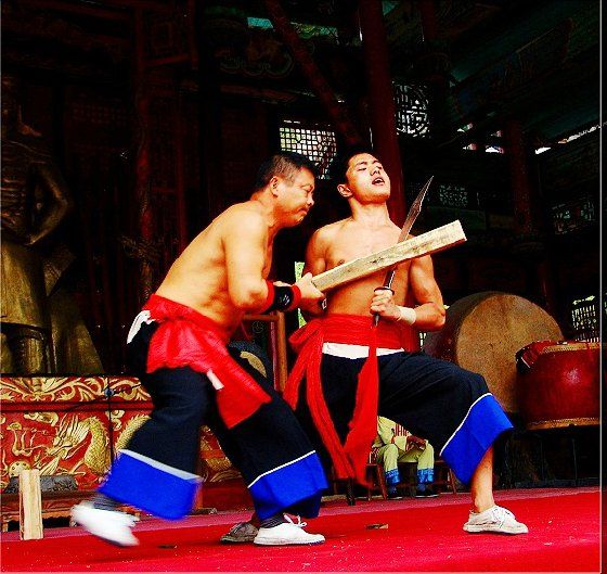 大庸氣功 大庸氣,堪稱武林奇葩,曾為祖國贏得聲譽,海內(nèi)外享有極主名望。 大庸氣功是大庸各民族特別是土家族傳統(tǒng)體育項 目之了,分健體氣派、武術(shù)氣功兩類。前者有“返還 功”、“馬王推氣功”、“少林達摩醫(yī)療保健氣功” 等;后者有靜坐、壁虎、靈子、二指彈、碎石、松靜 、硬氣、五禽、五陽功等,尤以硬氣功著稱。大庸硬 氣功,歷史悠久,漢代相單程,明代覃后,清代劉明 燈,當代湯子模、周鐵鞭、杜心武、趙繼書等都具有 超人硬氣武功。大庸土著民族在漫長的反征服、反壓 迫斗爭,博采武當、少林南北派、昆侖派眾家武林精 華,創(chuàng)造出獨此一家的大庸硬氣功。 據(jù)傳,大庸硬氣功鼻祖是楚國鬼谷子?!?a class="insidelink" href="http://www.xmhenglide.com/cityinfo/15580531721.html" title="永定區(qū)">永定縣 志》有關(guān)鬼谷子隱居天門山鬼谷洞潛心學《易》、傳 授方術(shù)的記載。到清代有武林高手朱茂嶺,隱居三岔 村北芭蕉灣洞,研究鬼谷氣功之術(shù),后收西溪坪胡口 子、余世萬(即“余通人”)為徙,傳其衣缽。余通 人將武術(shù)氣功系統(tǒng)整理,發(fā)揚光大,播名于世。 新中國成立后,黨和政府十分重視民間氣功發(fā)掘 整理,并正式列為體育項目加以普及發(fā)展,今日大庸 市習練硬氣功達數(shù)萬人眾。永定區(qū)官黎坪村世有“硬 氣功之鄉(xiāng)”盛譽,該村男女老幼,練功已蔚成風氣, 其武師趙繼書,1979年先后參加全省和全國武術(shù)大賽 ,均獲一等獎,受到國家體委重視,同年7 月趙繼書 專程到北京給中央領(lǐng)導同志匯報表演。嗣后,隨同中 國武術(shù)代表團和國家領(lǐng)導人先后兩次出國,到盧森堡 、意大利、比利時、羅馬尼亞、馬其他和東南亞等國 家訪問。他表演的臥刀碎石、頭頂開石、雙鳳灌耳、 頭碰石柱、叉尖推磨等精彩節(jié)目,博得外國友人好評 。盧森堡一位榮獲國家獎牌的武士,看了表演后連夜 來到中國大使館,將自己珍藏多年的獎牌贈送給他; 盧森堡國王主動熱情走上臺與趙繼書熱情擁抱,連連 稱贊:“了不起!了不起!國際氣功大師!”并把珍 藏紀念章一枚贈送給趙繼書。一位法國朋友十分贊賞 說:“中國的氣功,稱為全人類的寶貴財富,是有科 學道理的。”自此,大庸硬氣功譽滿全球。湖南瀟湘 電影制片廠專門拍攝了彩色紀錄片《大庸氣功》。 大庸硬氣功共有二十多個項目,最有影響的是: 腹臥鋼叉 由二人在地面扶住一根叉尖朝上的三 股鋼叉,叉尖猁鋒利,然后一個俯身叉尖,尖抵腹部 ,待其四肢平展懸空,扶叉二人轉(zhuǎn)動鋼叉,謂之推磨 。表演時,要求臥叉者運氣于腹,氣意集中,稍有大 意,叉即穿腹而過。 臥刀破石 先固定兩把大刀,刀口朝上,臥刀者 運氣后,由其他人抬臥于刀口上(有仰臥、俯臥兩種) ,然后在臥刀者腹部或背部置一碩大石條(約數(shù)百斤) ,一人或兩人輪大鐵錘狠擊石條直至斷裂破碎為止。 釘?shù)洞财剖?地上倒一層碎玻璃片,一人仰臥其 上;然后腹上置釘床,又一人仰臥釘床上,再于第二 人腹上置釘床,第三人仰臥刀床上,腹部上壓一塊數(shù) 百斤大條石,由人掄錘狠砸,至石破為止。 銀槍刺喉 用一根兩頭安有鋒利槍頭的鋼槍,抵 置兩位表演者喉部,然后相對發(fā)力,至槍桿抵成彎弓 形而喉部安然無恙。 徙手斷石 表演者將堅滑如鐵一塊卵石置于石凳 (地)上,然后運氣于掌或指擊斷(碎)卵石。 踢腿斬石 表演者運氣于腿,以腿踢斷石條。一 般可踢斷15公分以上厚度的麻石條或青石條。 胸部打刀 將鋒利大刀刃口置于胸部肌肉上,用 一根拳頭粗木棒猛擊刀背,至棒斷而胸部無傷。 新中國成立以來,大庸民間武術(shù)與民族體育逐漸 融為一體,發(fā)揮著提高人民身體素質(zhì)、弘揚中華武術(shù) 傳統(tǒng)和增進國際友誼重大作用。除硬氣功外,還有數(shù) 十種武術(shù)形式散見于民間武術(shù)體育活動之中。如打飛 棒、扭扁擔、抵搭斗杠、擠油渣、甩抱腰、舉石鎖、 板牛角(一種斗牛形式)等等。其特點是因地制宜, 不分場地,凡田園地角院壩集鎮(zhèn),都是習武練功、開 展活動的處所,頗具泥土氣息。擬或以生活中某些動 作和動物的某種形態(tài),稍加模仿演繹,便成某一獨特 武術(shù)形式。如天門武術(shù)功夫大師余道人所創(chuàng)造的“宮 天梳”、“巖燕樸天門”等;也有就地理特點創(chuàng)造某 種武功形式的,如“蕩藤”等。 以上部分圖片均來自互聯(lián)網(wǎng),出處不詳,請作者與本站聯(lián)系。 |