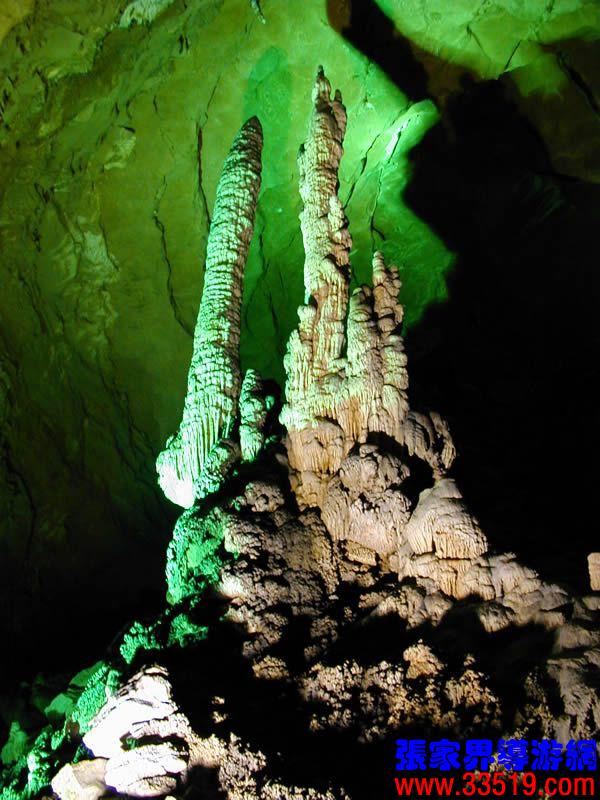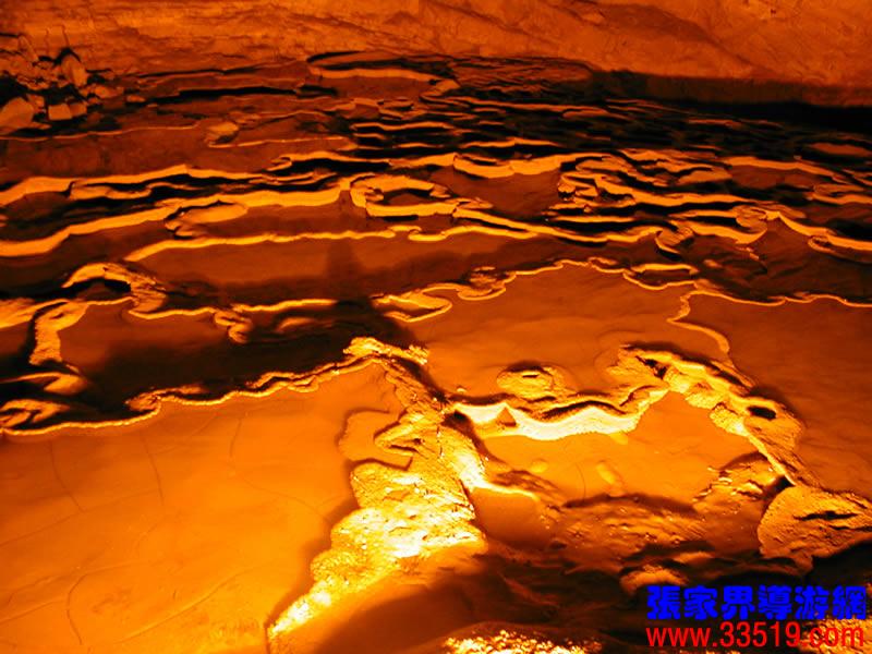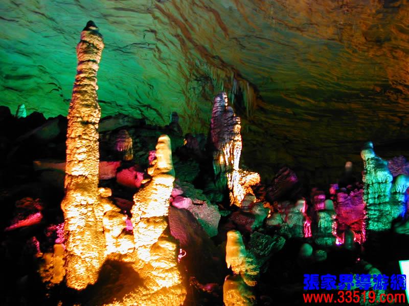 (龍宮)龍宮是黃龍洞十三個(gè)大廳中最大的一個(gè),也是景色最美的景點(diǎn)之一,底面積15000平方米,平均高40米,兩千余根石筍拔地而起,千姿百態(tài),異彩紛呈,或如飛禽走獸,或如宮廷珍藏,有的像巍巍雪松,有的像火箭升空。龍宮后園有金銀兩座花池,清水常溢,花簇盛開。宮頂鐘乳柳垂簾掛,四周壁畫栩栩如生。溶解著各色各樣的礦物質(zhì)的水,從巖層中滲透出來,滴落下來。礦物質(zhì)在洞頂凝固結(jié)晶成倒懸鐘乳石,從鐘乳石滴落的水又把礦物質(zhì)澆疊、堆壘在洞底,而長成節(jié)節(jié)向上的石筍。大家看看這龍宮的造型,領(lǐng)略這磅礴的氣勢(shì)。洞內(nèi)最大石筍,高12米、直徑10米的漢白玉天然石椅“龍王寶座”居高臨下,眾多石柱石筍似人似物,維妙維肖,圍著寶座朝拜山呼,幾十座珊瑚亭亭玉立,儼然一支龐大的“宮廷樂隊(duì)”。湖南著名教授羊春秋先生作《寄生草》詞對(duì)此進(jìn)行描繪:“百態(tài)千姿模樣,三宮六院門巷。龍王開宴設(shè)瓊漿,猴王偷果鬧天堂,君王納寵擁羅帳。搬演了人間爭攘,匯集了天下奇觀。”