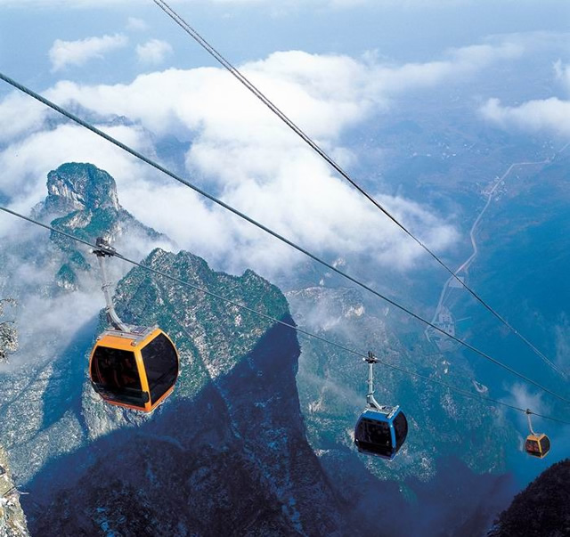 天門索道:索道線路斜長7455米,上、下站水平高差1279米,是世界最長的單線循環(huán)脫掛抱索器車廂式索道,猶如一道彩虹飛渡“人間” “天上”,又像一條巨龍騰翔素云蒼穹,依山籍壁,拔地沖天,蕩氣回腸,恢宏壯觀,成為天門山旅游風(fēng)景區(qū)“四大奇觀”之一。