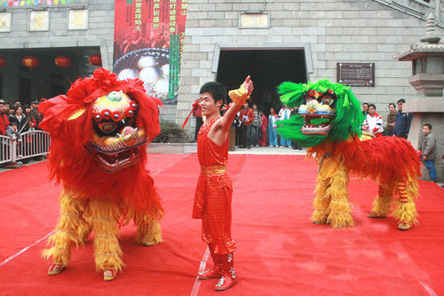 有布獅和毛獅兩種,舞時(shí)又分文獅和武獅。文獅刻畫獅子溫馴神態(tài),動(dòng)作詼諧細(xì)膩;武獅顯獅子勇猛,動(dòng)作幅度強(qiáng)。舞獅的套子有“藤纏樹”、“烏云蓋雪”、“牛戀凼”、“泥鰍彈鍋”、“麒麟送子”等。用打擊樂和吹奏樂伴奏、氣氛熱烈莊重。舞獅時(shí)還有贊獅者伴唱,唱詞內(nèi)容有反映勞動(dòng)生活、祝賀吉祥、介紹傳說故事等,舞獅者隨唱詞內(nèi)容和節(jié)奏進(jìn)行表演。