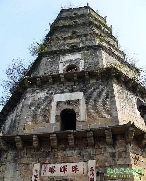 塔高10丈5尺,磚石結(jié)構(gòu),七層八棱,石階旋梯。正門西南向,上方漢白玉橫額鐫刻著斗大楷書“珠暉塔”三字,兩邊漢白玉雕刻楷書對聯(lián):“高峙船山遠(yuǎn)綿學(xué)脈,流回耒水廣助文瀾”。塔基四周刻有飛禽走獸圖形,塔內(nèi)拱門嵌有石刻碑文,為江蘇學(xué)政王先謙撰寫、寧夏知府黃自文手書,原為6塊,現(xiàn)存4塊。塔前建有廊廡,僧房數(shù)楹。塔尖銅頂,映日生輝。