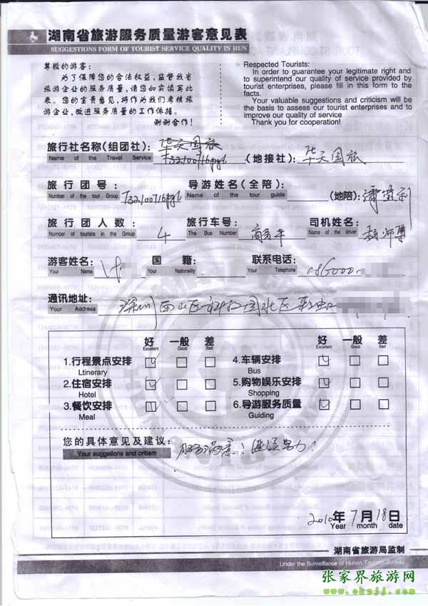 2010年7月18日深圳葉先生一行4位旅游質(zhì)量反饋