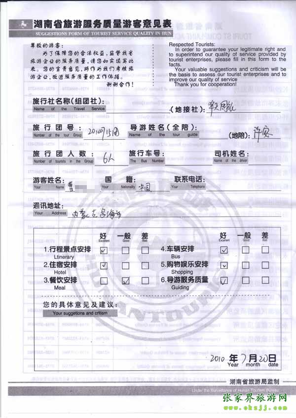 2010年7月20日內蒙曹先生一行6位旅游質量反饋