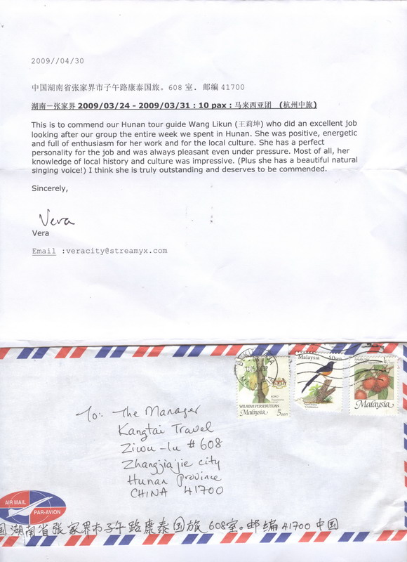 馬來西亞團至導游“王莉坤”表揚信