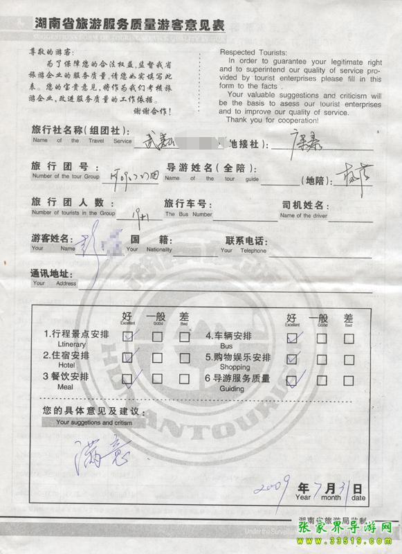 2009年7月27日彭女士一行20人接待質量反饋單: