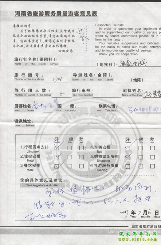 2009年7月4日鐘先生一行6人接待質(zhì)量反饋單: