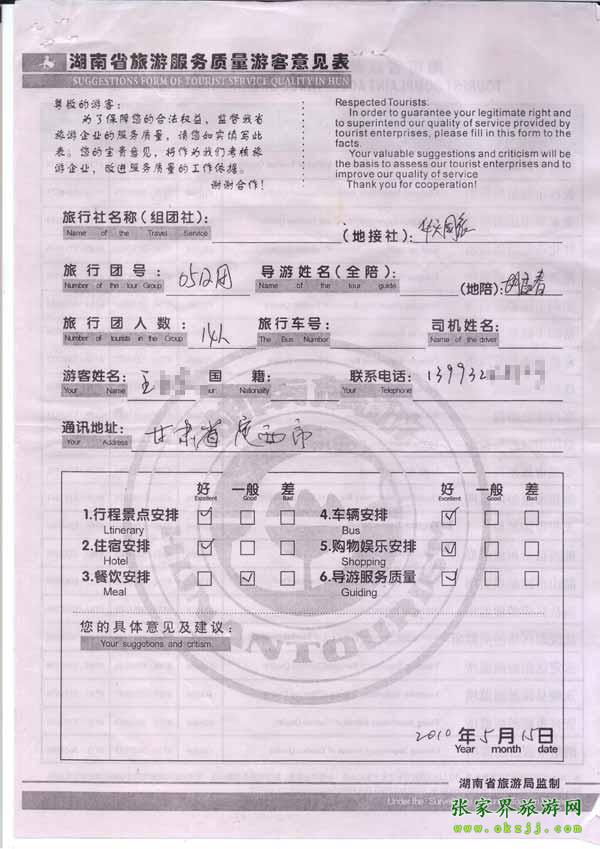 2010年5月15日甘肅王小姐一行14位旅游質(zhì)量反饋