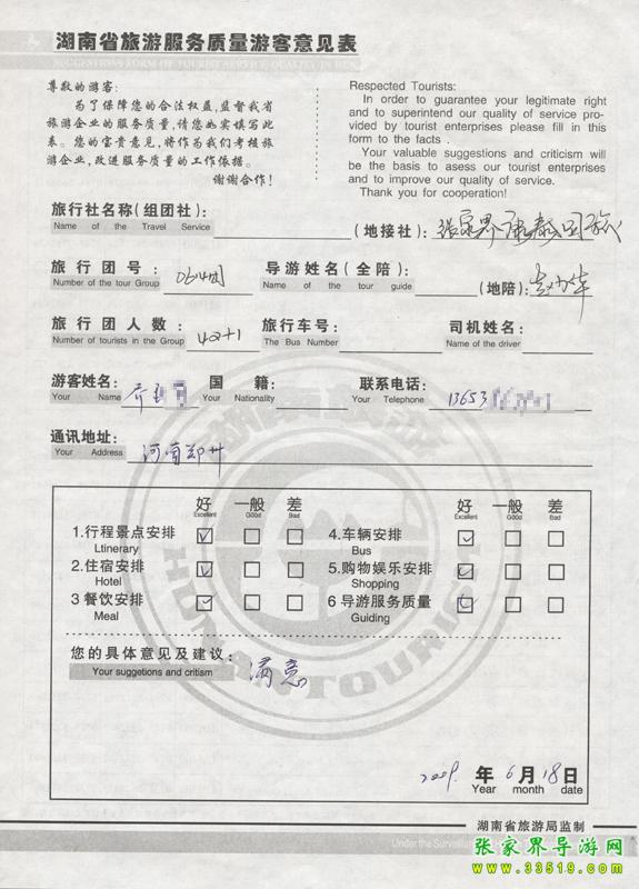 2009年6月14日河南喬女士一行42人接待質(zhì)量反饋單: