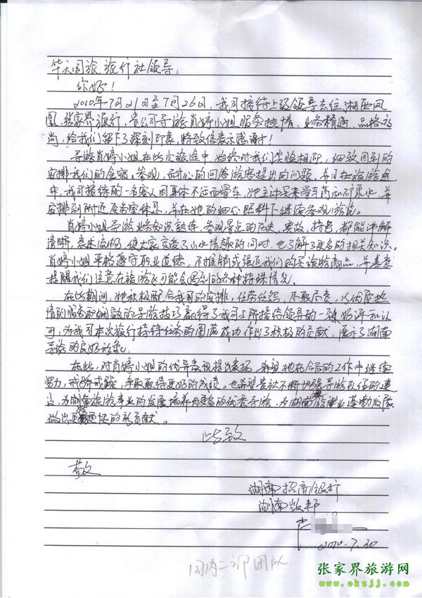 - 游客夏先生為表揚(yáng)導(dǎo)游李姣姣寫來表揚(yáng)信致我張家界... [14811]